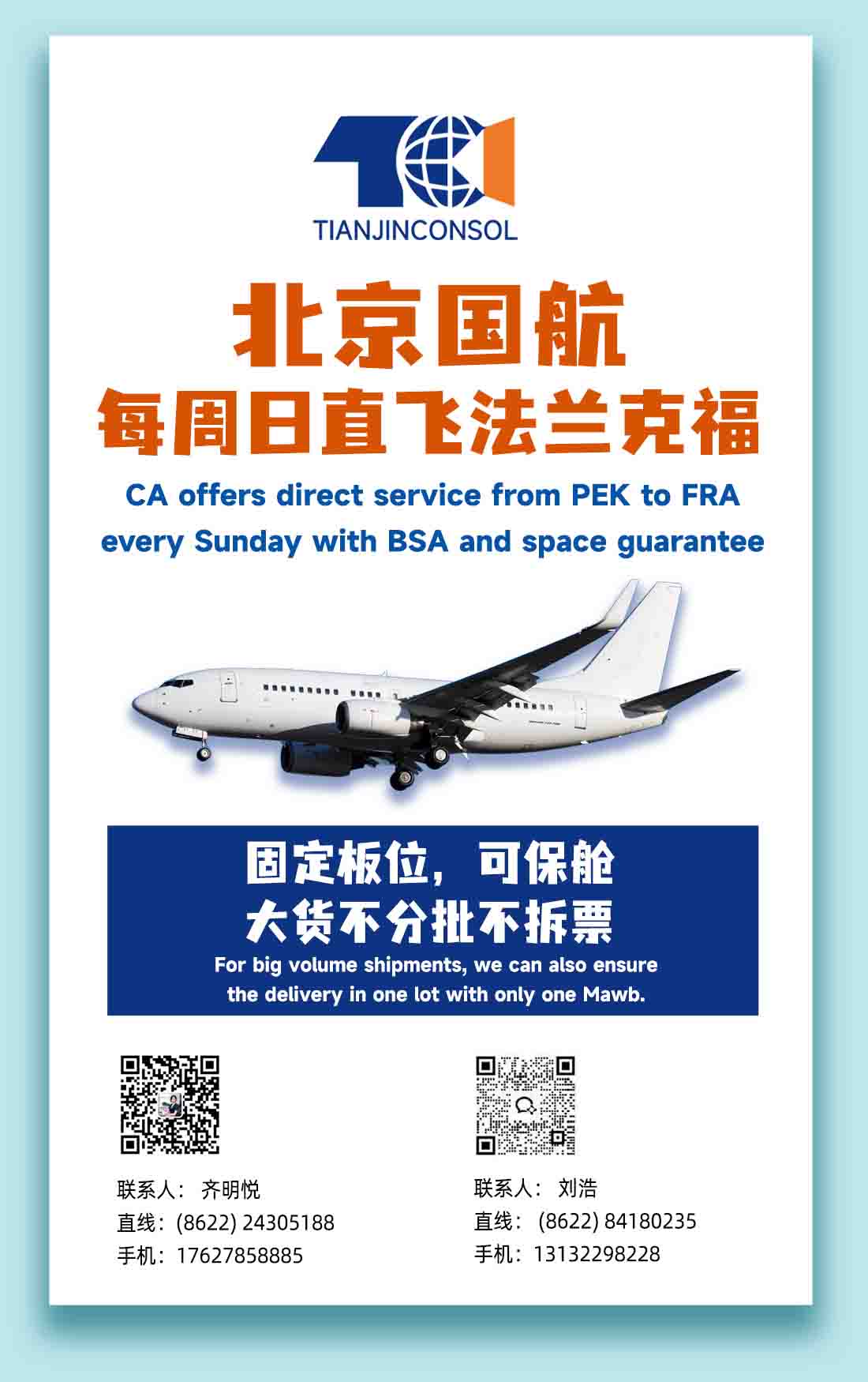 北京CA直飛法蘭克福 固定板位可保艙 大貨無憂